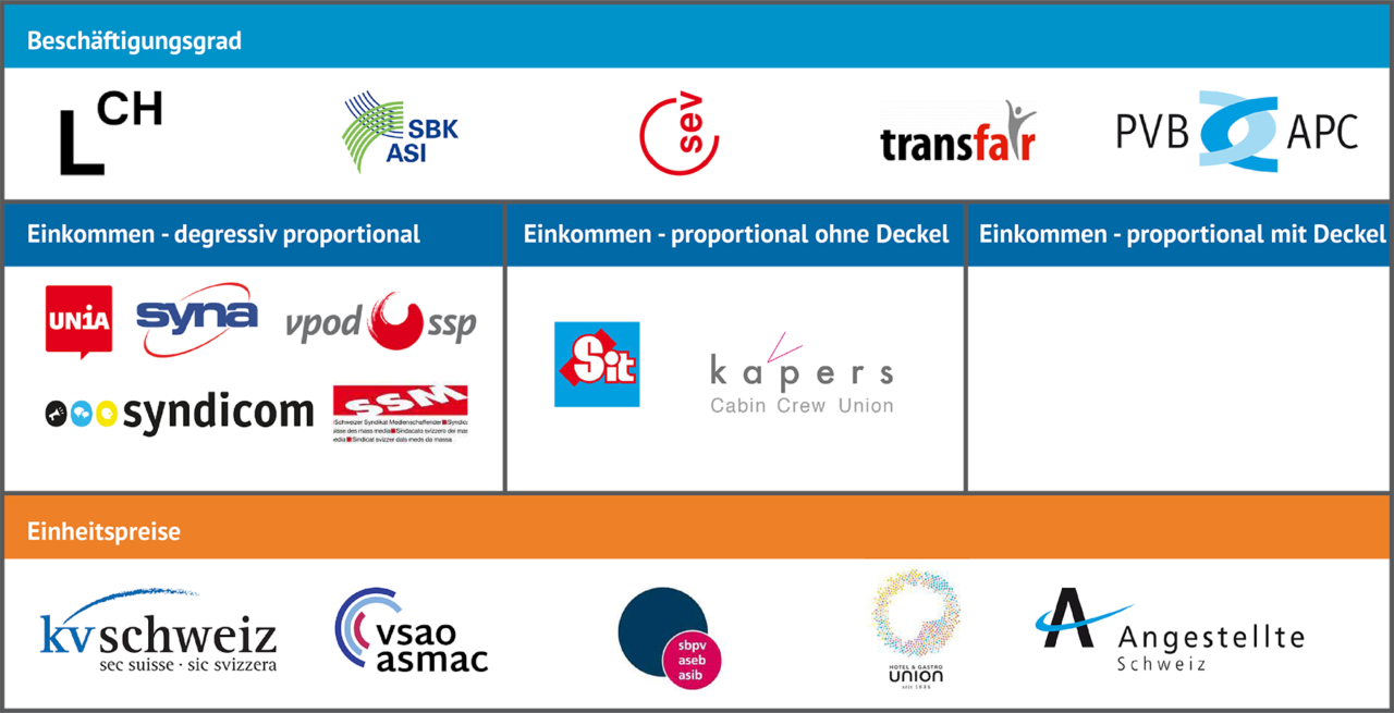 Die Mitgliederbeiträge nach Einkommen sind mehrheitlich degressiv proportional zum Lohn. Dies bedeutet, dass Mitglieder mit einem tiefen Einkommen prozentual zu ihrem Lohn mehr bezahlen als Mitglieder mit höheren Salären. Auch hier bilden SIT und Kapers eine Ausnahme. Ihre Mitgliederbeiträge sind über alle Einkommenskategorien prozentual gleich hoch und entsprechen 0.7% des Salärs ihrer Mitglieder. In der Schweiz fand ich keinen Verband, welcher proportionale Mitgliederbeiträge mit einem Deckel bzw. Höchstbeitrag praktiziert.