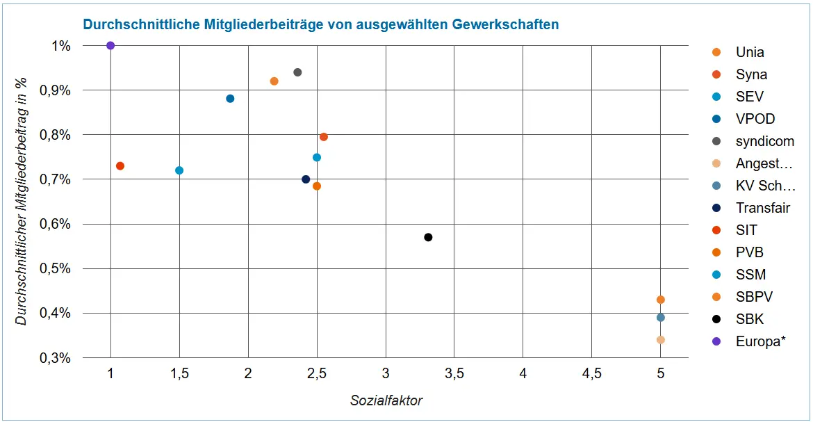 Oben links befindet sich der Punkt für die europäischen Gewerkschaften. Der durchschnittliche Mitgliederbeitrag beträgt 1% und alle Mitglieder bezahlen den gleichen Anteil ihres Einkommens an die Gewerkschaft. Unia und syndicom sind mit Werten über 0.9% die nächstplatzierten Gewerkschaften, was die durchschnittlichen Mitgliederbeiträge anbelangt. Hingegen befinden sie sich auf der Sozialfaktor-Achse viel weiter rechts, da die tiefen Einkommen prozentual deutlich mehr als die hohen Einkommen an die Gewerkschaft abliefern.