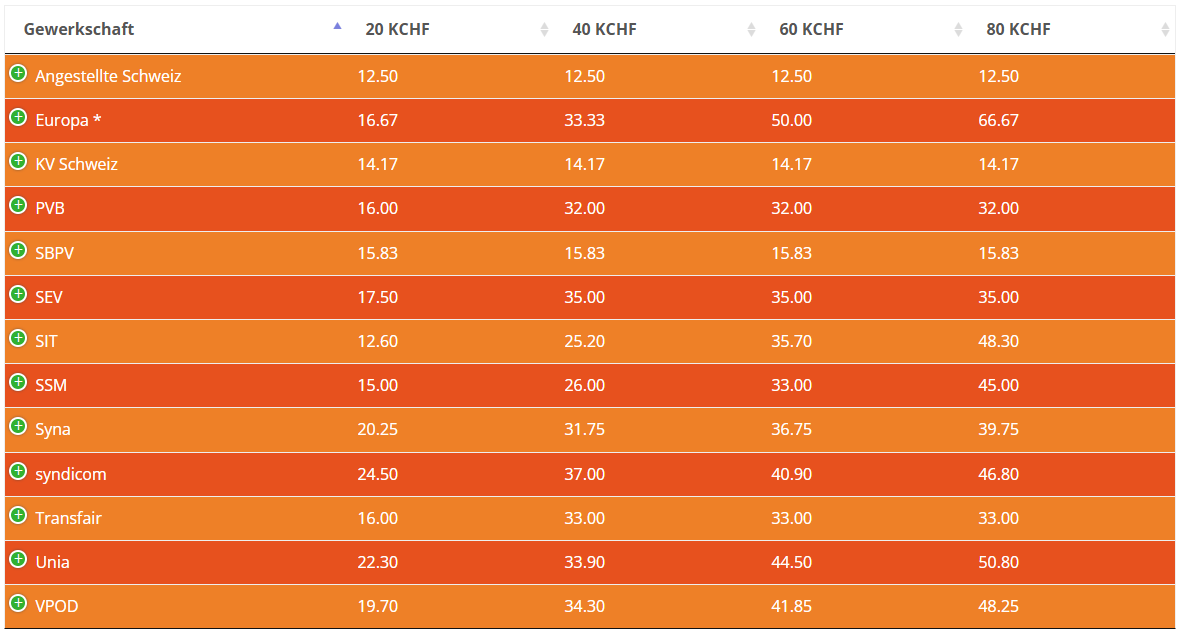 Der SEV gewährt einen Rabatt von 50% für Mitglieder mit Arbeitspensen unter 50%. Ansonsten verwendet die Gewerkschaft des Verkehrspersonals einen Einheitsbeitrag. Zusätzlich werden Unterverbands- und Sektionsbeiträge in unterschiedlicher Höhe verrechnet, was einen Vergleich mit anderen Gewerkschaften fast verunmöglicht. Für diese Analyse habe ich den Durchschnittsbeitrag aller Sektionen verwendet. Ein ähnliches Beitragssystem ist auch im Personalverband Transfair in Kraft. Dort gibt es einen Einheitsbeitrag von 33 Franken ab einem Arbeitspensum von 60%. Weiter gibt es Kategorien für Arbeitspensen bis 20%, 20 bis 40% und 40 bis 60%. Und um es noch komplizierter zu machen, verfügt der Personalverband noch über unterschiedliche Beitragstabellen für die Branchen Communication und öffentlicher Verkehr. Der PVB gewährt ebenfalls einen Rabatt von 50% auf den Mitgliederbeitrag, falls das Mitglied weniger als 75% arbeitet. Ansonsten beträgt der Einheitstarif 32 Franken pro Monat.